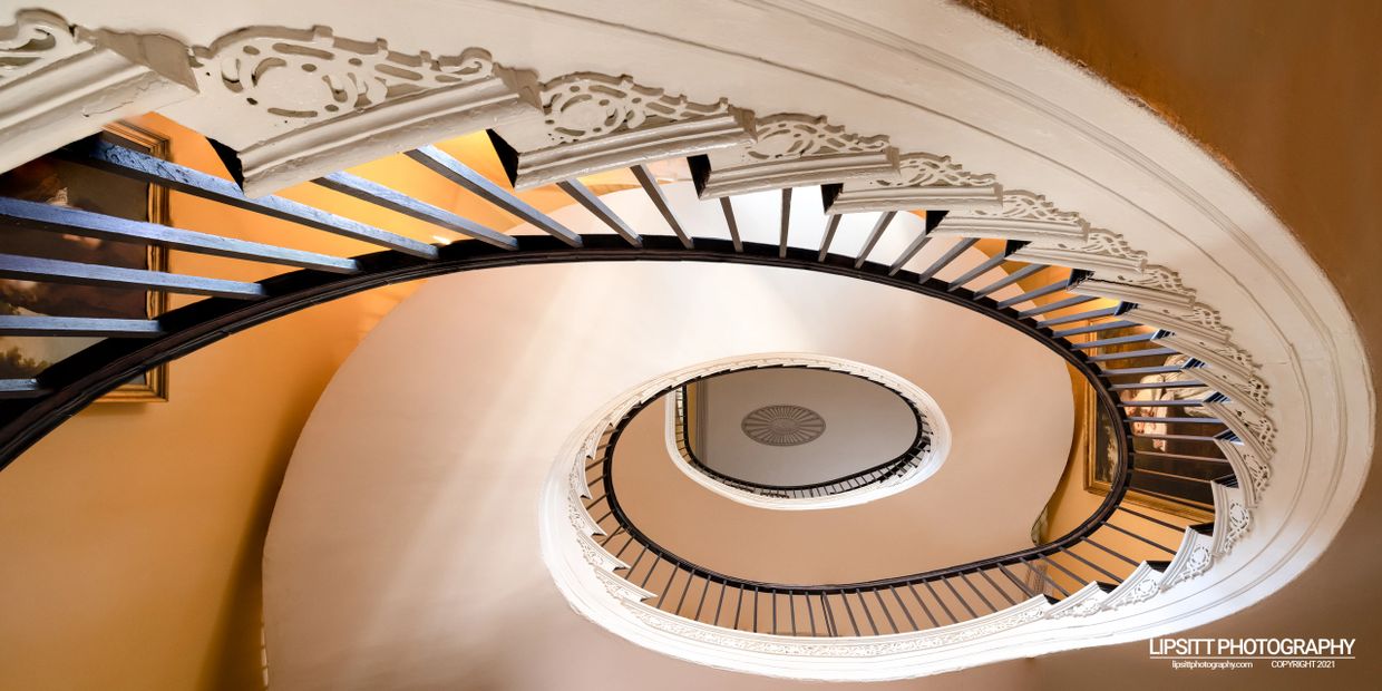 Built in 1808 for Nathaniel Russell, a wealthy merchant and trader, this house is now recognized as one of America's most important Neoclassical houses. The unknown architect delighted in elliptical curves, and designed these spiraled free-standing stairs in a squared hall to better emphasize the curve. The magnificent flying staircase rises three flights up without any support or the use of a single nail in its construction.